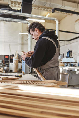 DIY woodworking and furniture making and craftsmanship and handwork concept. Carpenter working on woodworking machines in carpentry shop. Young man working as carpenter and taking wood stock.