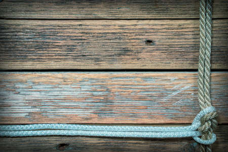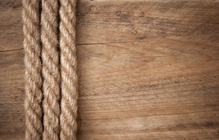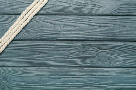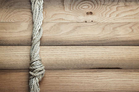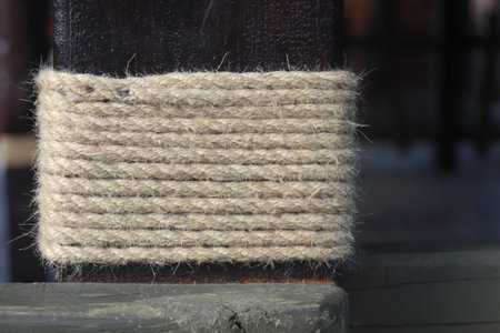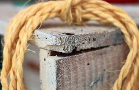 Close-up of a thick hemp rope. Natural rope on an old wooden table. Side view. Soft focus.
