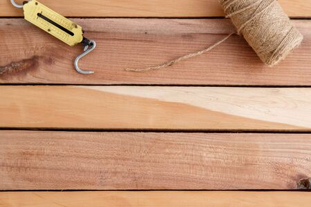 A roll of twine on a wooden background. Selelective focus. Close-up. Free space for text.