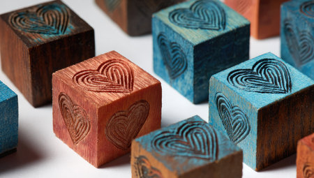 Collection of small, wooden cubes, each painted a different shade of color and imprinted with a detailed heart design. The hearts are created by a series of incised lines forming a stylized pattern. The focus is on the intricate details of the design on the wood blocks.