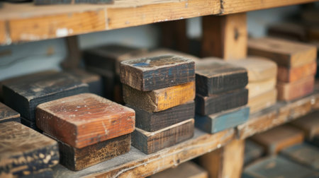 A stack of wooden blocks used for resist dyeing techniques sit neatly on a shelf next to the dye vats