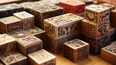 A colorful array of handmade printing blocks, each displaying unique patterns and textures. The blocks rest on a rustic wooden surface, illustrating craftsmanship and creativity.