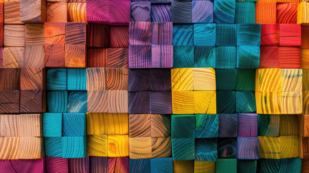 Wooden blocks arranged in a colorful mosaic pattern providing a vibrant texture background