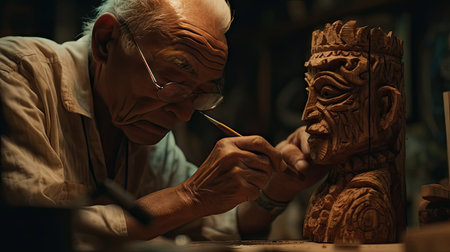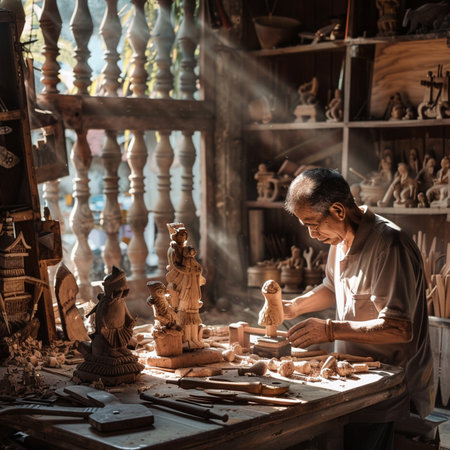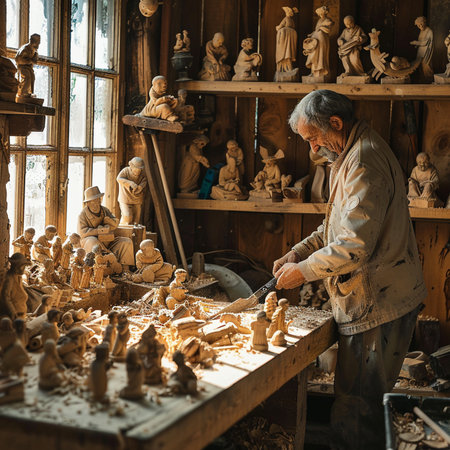 An elderly artisan focuses on carving delicate details into a wooden sculpture in a cluttered workshop, surrounded by completed works and tools.
