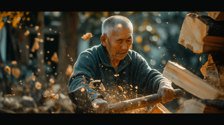 Old man chopping wood with a chisel in his hand, sawdust flying around