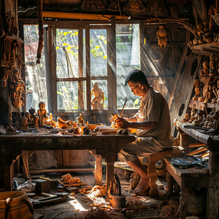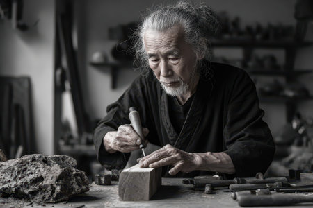 In the quiet focus of a workshop, the weathered hands of a master artisan guide a sharp chisel across a block of wood.