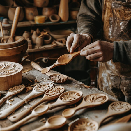 woodworker carefully shaping wooden spoon with hand tools, created with generative ai