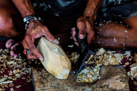 Close-up of craftsman carving wood with knife, woodworking and craftsmanship concept, skilled hands shaping wooden block, hobby and creative occupation, handmade art, detailed work.