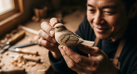 A close-up on a craftsman's hands gently holding a small, beautifully carved wooden bird with intricate feather details. The artisan looks at his creation with a gentle smile, surrounded by wood shavings in his workshop, representing skill, passion, and traditional craftsmanship.