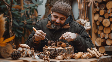 A skilled craftsman carves wood outdoors, surrounded by shavings and nature. A cozy scene showcasing creativity and focus during a tranquil moment.