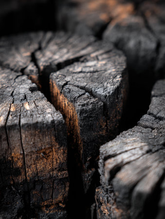 Charred wood shows intricate textures and cracks from fire and natural aging in an outdoor setting.