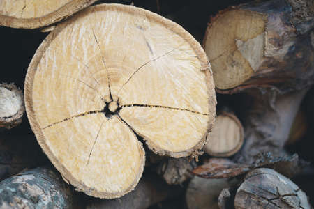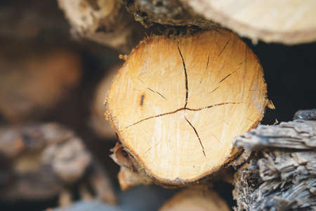 Stacked firewood storage close up. Stocks of wooden logs texture. Chopping wood logging in the village. Woodpile and rustic lifestyle concept.