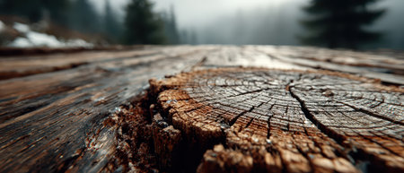 Texture of an old wooden surface shows rings and grain surrounded by misty trees. The atmosphere is calm and serene during early morning.