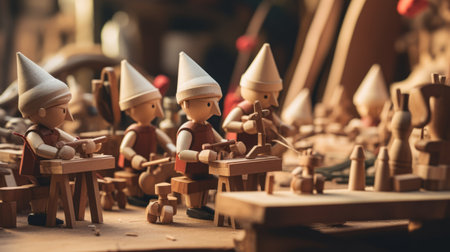 wooden Pinocchio dolls busily working in a toy-making workshop.High resolution AI generated