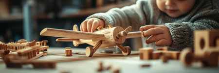 A lifestyle photo focusing on hands playing with a wooden airplane and building blocks, showcasing the simplicity creativity of children toys in a cozy, candid setting, banner