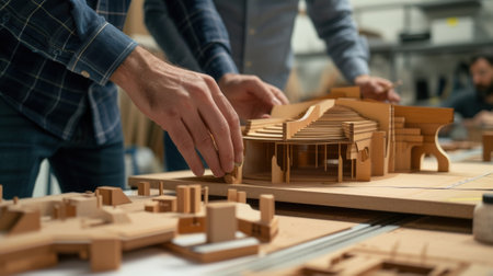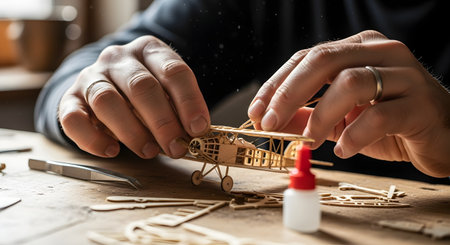 A close-up of a man's hands carefully assembling a detailed wooden model of a biplane. The scene, set in a workshop, highlights the precision, patience, and enjoyment of a hobby like model building.