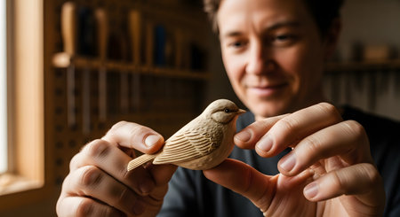 A close-up on a craftsman's hands gently holding a small, beautifully carved wooden bird with intricate feather details. The artisan looks at his creation with a gentle smile, surrounded by wood shavings in his workshop, representing skill, passion, and traditional craftsmanship.