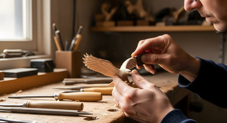 A skilled craftsman is shown in his workshop, meticulously sanding a detailed wooden sculpture of an eagle with its wings spread. Various carving tools are laid out on the workbench, highlighting artistry, patience, and traditional craftsmanship in woodworking.