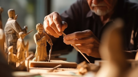 A detailed close-up shot of a craftsman's hands meticulously carving a small wooden human figurine with a sharp carving knife. Wood shavings are scattered on the rustic wooden workbench, highlighting the intricate process of this traditional art and craft. The image emphasizes skill, precision, and the creation of a handmade object.