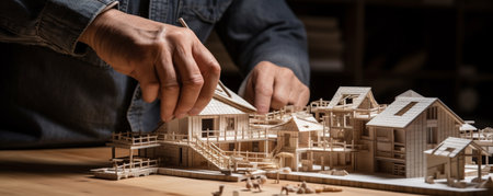Close-up of a man's hand building a model of a house