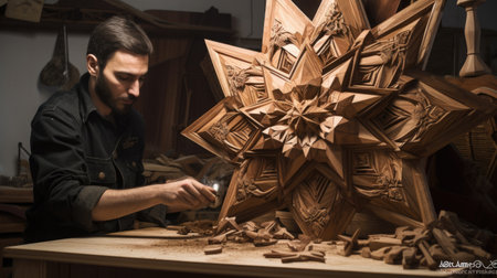 The man working on a wooden mans hand with a wooden star in workshop. Generative AI AIG21.