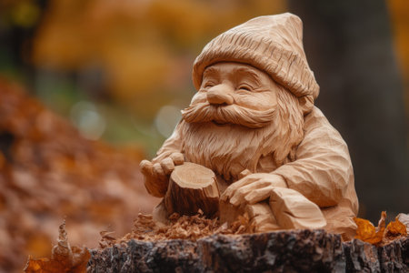 A cheerful gnome sculpture made of wood rests on a log surrounded by autumn leaves and colorful trees.