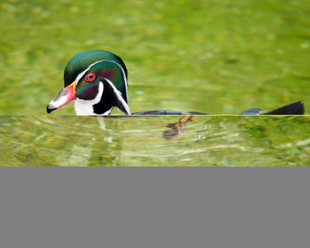 Male wood duck on green water, Duck swimming