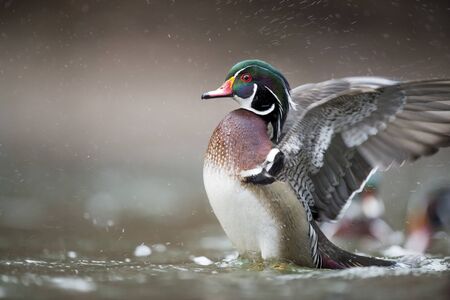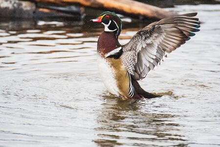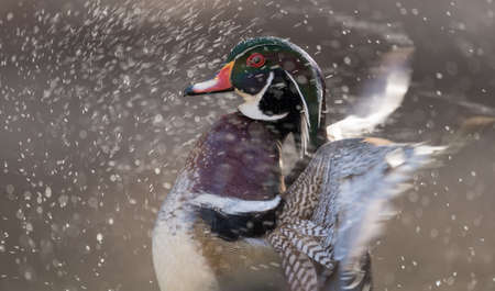 A Bathing Wood Duck Spreading Their Wings and Splashing Water Around. Vancouver BC Canada