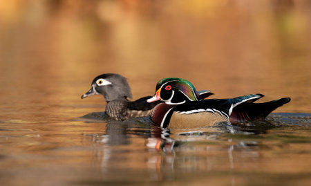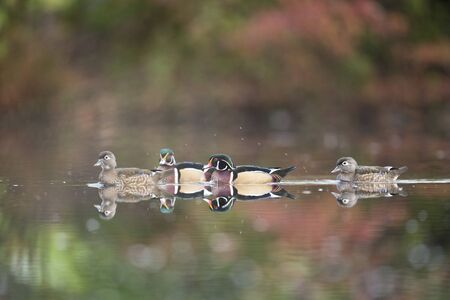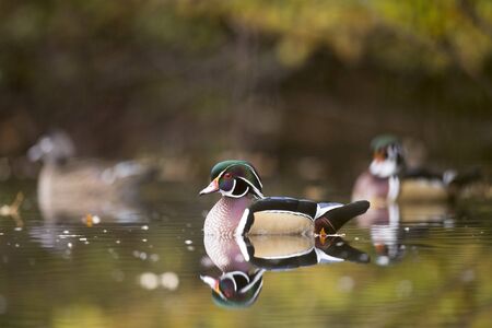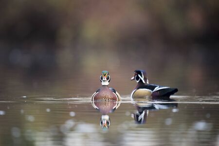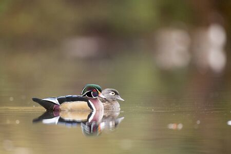 Male and female Wood Ducks swim on a calm pond in autumn with the colorful trees reflected in the calm clear water in soft overcast light.