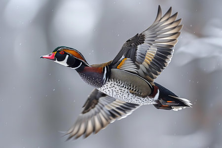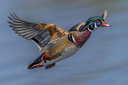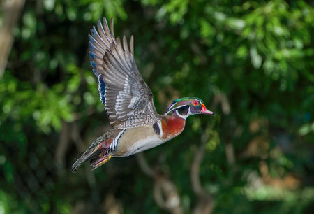 wood duck Aix sponsa male drake in flight with wings up. View of underside with feathers in great detail