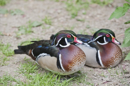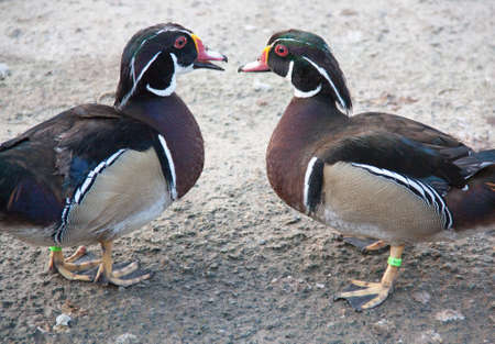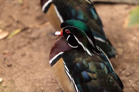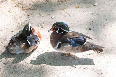 Two Wood Ducks are standing in the sand. Also known as Carolina Duck. With bright colors in the sunlight.