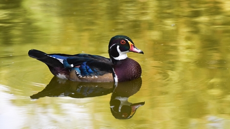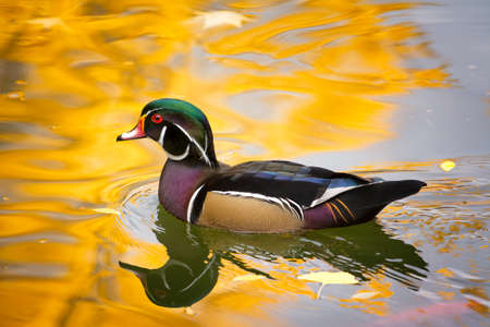 Colorful Texas wood duck cruising a pond lit by reflections from golden autumn foliage
