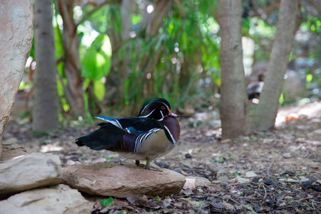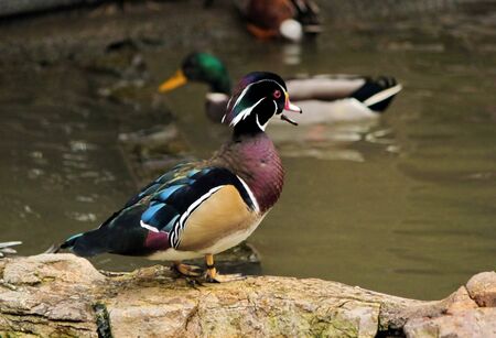 Beautiful colorful wood duck standing on rocks with open beak as talking to other ducks in the pond
