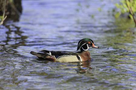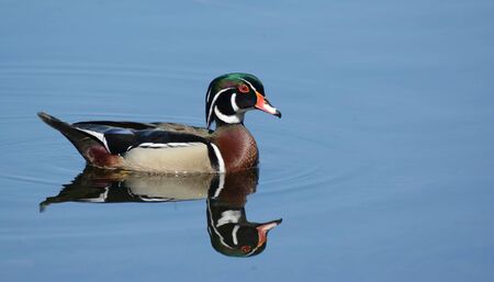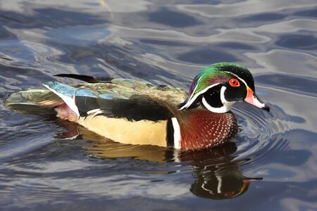 Male Wood Duck (aix sponsa) swimming in blue water