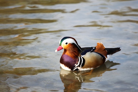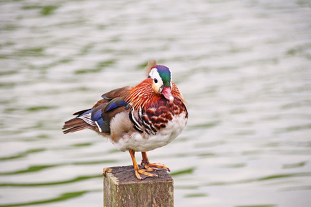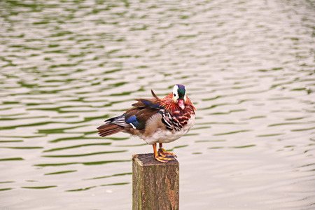Mandarin Duck Drake on water in summer