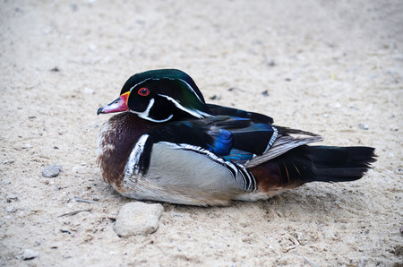 A Mandarin duck male laying on the ground.