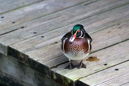 Wood duck standing on a dock