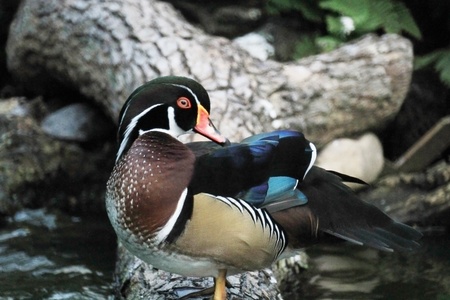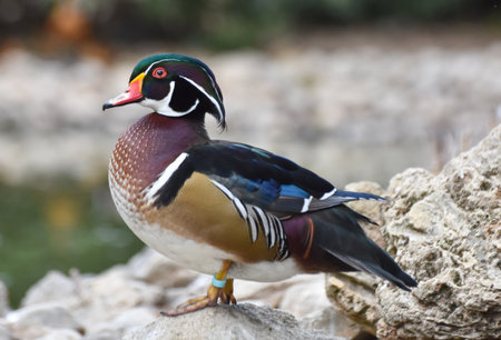 Male caroline duck ( wood duck ) standing on rock near a pond
