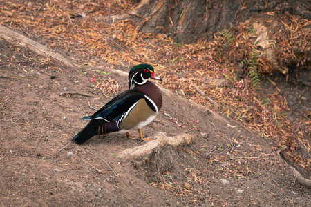 Male wood duck walks on dry land