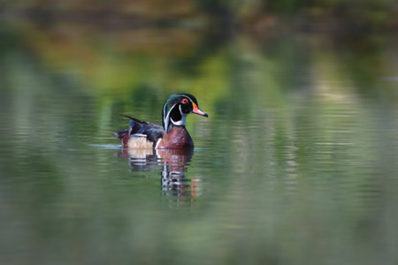 Drake wood duck swimming in a tranquil lake habitat.