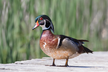 Close up of colorful male wood duck standing on plank walkway