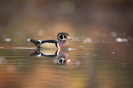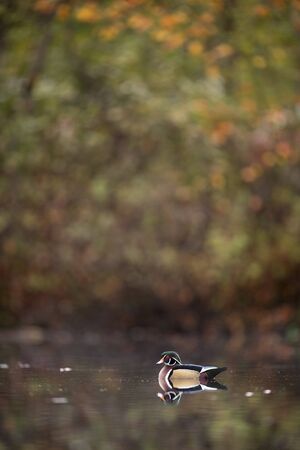 A male Wood Duck swims on calm water with its reflection and a smooth background of autumn colorful leaves.
