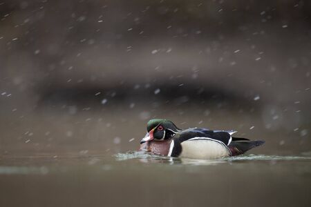 Colorful male Wood Duck swimming in water in falling snow on a cold winter day.