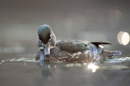 A close-up portrait of a female Wood Duck swimming in water with a smooth background in soft light.