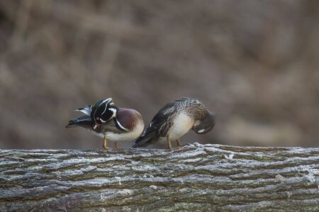 A pair of Wood Ducks perched on a log over water in soft light with a smooth brown background.