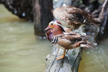 Wildlife scene with beautiful pair of water birds Mandarin Ducks on pond or river background