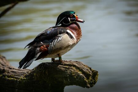 Beautiful Wood Duck, Aix sponsa, in sunlight with green water in background.