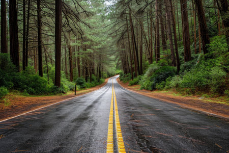 A tranquil road meanders through a majestic redwood forest, with sunlight filtering through tall trees, creating an enchanting atmosphere of nature's beauty.
