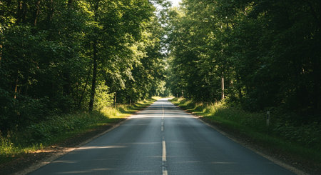 A scenic road bordered by trees, yellow line in the middle, creating a classic and inviting travel scene