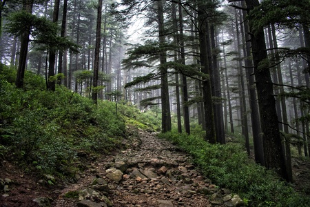 Scenic high angle view of a remote path winding through a lush, green mountain forest during a rain shower, surrounded by tall evergreen trees and a rocky hillside.